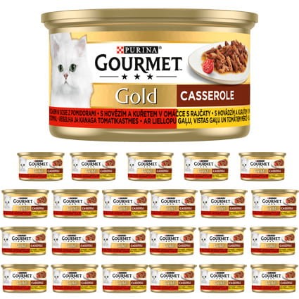 Nawet najbardziej wybredne z kotów będą zachwycone Gourmet Gold: menu wykwintnych dań, które różnorodnością tekstur i smaków rozpieszczają wyrafinowane podniebienia każdego dnia. Właśnie dlatego stworzyliśmy Gourmet Gold Casserole - smakowite kąski mięsne lub rybne, powoli gotowane w soczystym i wyrafinowanym sosie.. Czego mógłby chcieć więcej?