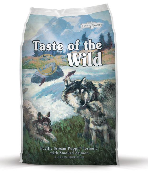 Taste of the Wild Pacific Stream Puppy z wędzonym i świeżym mięsem z łososia dla szczeniaków. Karma nie zawierająca ziarna zbóż. Dostarcza łatwo przyswajalnej energii szybko rosnącym szczeniakom. Za sprawą użycia do produkcji unikalnych surowców, jak świeże mięso łososia i wędzone mięso łososia uzyskano wyjątkowy i niepowtarzalny smak. Dodatek owoców i warzyw stanowi cenne źródło przeciwutleniaczy, wspomaga układ odpornościowy organizmu oraz działa prozdrowotnie.