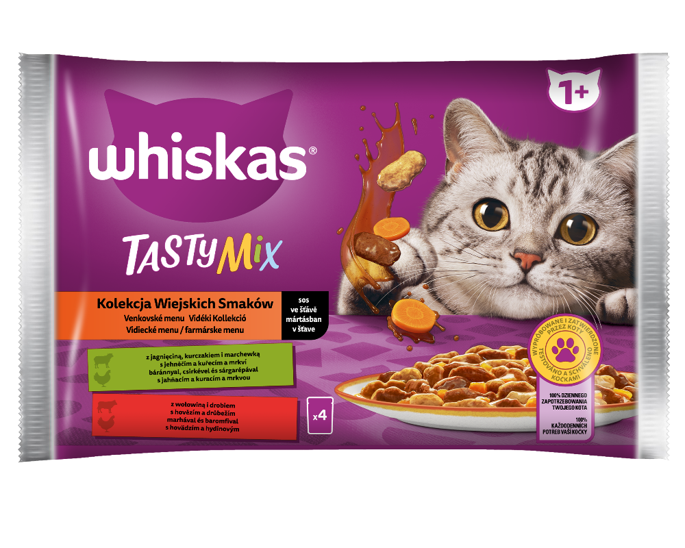 Posiłki Whiskas Kolekcja Wiejskich Smaków to zestaw starannie przygotowanych, kompletnych i zbilansowanych, mokrych karm dla dorosłych kotów. Koci przyjaciel rozsmakuje się w jednym z dwóch smaków: kawałki z jagnięciną, z kurczakiem i marchewką oraz z wołowiną i drobiem. W każdym wariancie smakowym znajdują się soczyste, mięsiste kawałki zanurzone w aromatycznym sosie, których wielkość została specjalnie dostosowana do kocich potrzeb. Ten smaczny pokarm w wygodnej saszetce zawiera cynk, który wspiera zdrowie skóry i sierści, a odpowiedni bilans minerałów pomaga zadbać o kondycję dróg moczowych Twojego pupila. Od figlarnego kocięcia po wspaniałego dorosłego kota – nasze smakowite receptury zostały opracowane z myślą o tym, aby kot w każdym wieku mruczał z zadowolenia w porze posiłku i nie tylko.