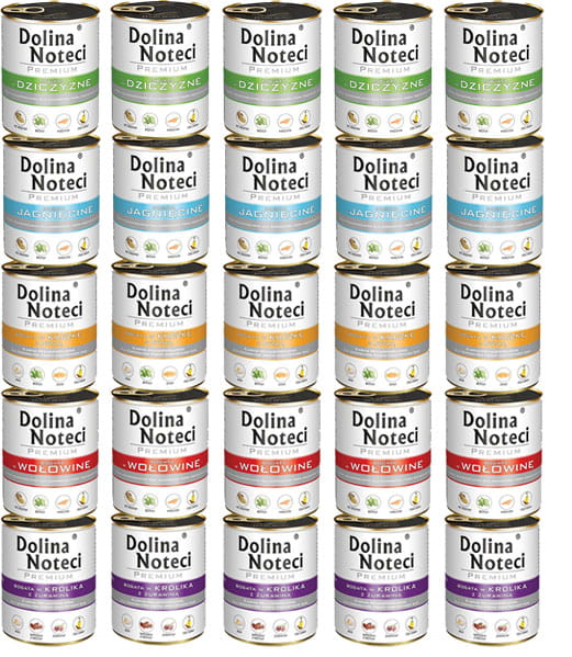Pakiet składa się z 30 puszek Karmy Dolina Noteci Premium 800g w 5 możliwych smakach spośród: